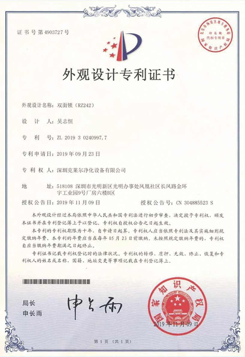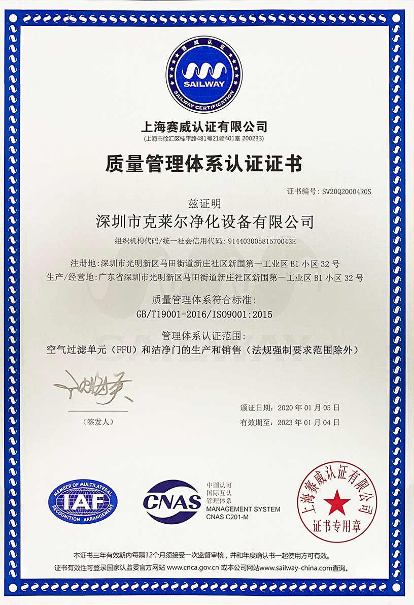 廣東克萊爾潔凈科技有限公司是一家集生產(chǎn)、研發(fā)、銷售于一體的專業(yè)潔凈門窗生產(chǎn)企業(yè)。 公司擁有現(xiàn)代化標(biāo)準(zhǔn)廠房10000多平方米,配備全自動(dòng)靜電噴涂流水線及 3000平以上萬級(jí)無塵生產(chǎn)車間,專供潔凈門及中空窗的生產(chǎn)裝配等。公司不斷引進(jìn)一流生產(chǎn)設(shè)備(如瑞士百超激光切割機(jī)、日本AMADA數(shù)控折彎機(jī)、超聲玻璃清洗機(jī)等),采用國際最先進(jìn)的技術(shù)及裝備確保產(chǎn)品品質(zhì),是華南區(qū)域最具規(guī)模的專業(yè)潔凈鋼制門及中空潔凈窗生產(chǎn)廠家。公司在同行業(yè)率先通過ISO9001質(zhì)量體系認(rèn)證,并先后獲得多項(xiàng)專利認(rèn)證及榮譽(yù)證書。 KLE purification equipment Co., Ltd. is a set of production, research and development, sales in one of the professional clean doors and windows production enterprises.The company has a modern standard workshop of more than 10000 square meters, equipped with automatic electrostatic spraying line and more than 30 million level dust-free production workshop, specially for the production and assembly of clean doors and hollow windows. The company constantly introduces first-class production equipment (such as Swiss Baichao laser cutting machine, Japanese AMADA CNC bending machine...